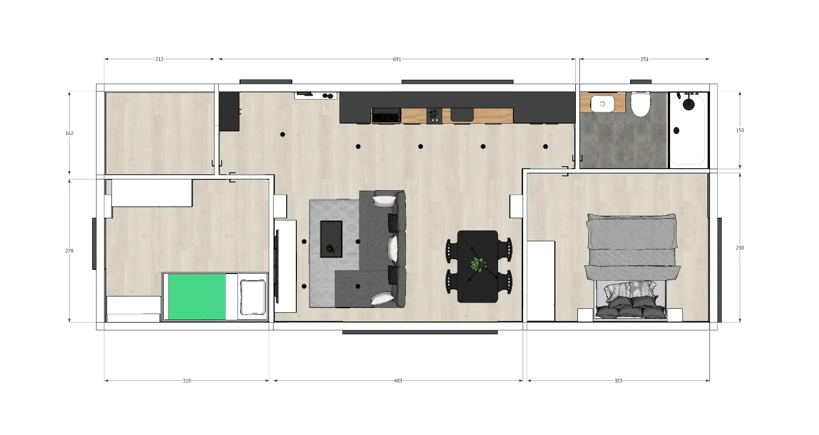 • Internal dimensions: 4.36 x 11.8 x h 2.45 m , internal area 51.45 m2: living room with kitchen 25.2 m2, bedroom 8.86 m2, bedroom 10.23 m2 , bathroom 3.76 m2, office 3.4 m2
