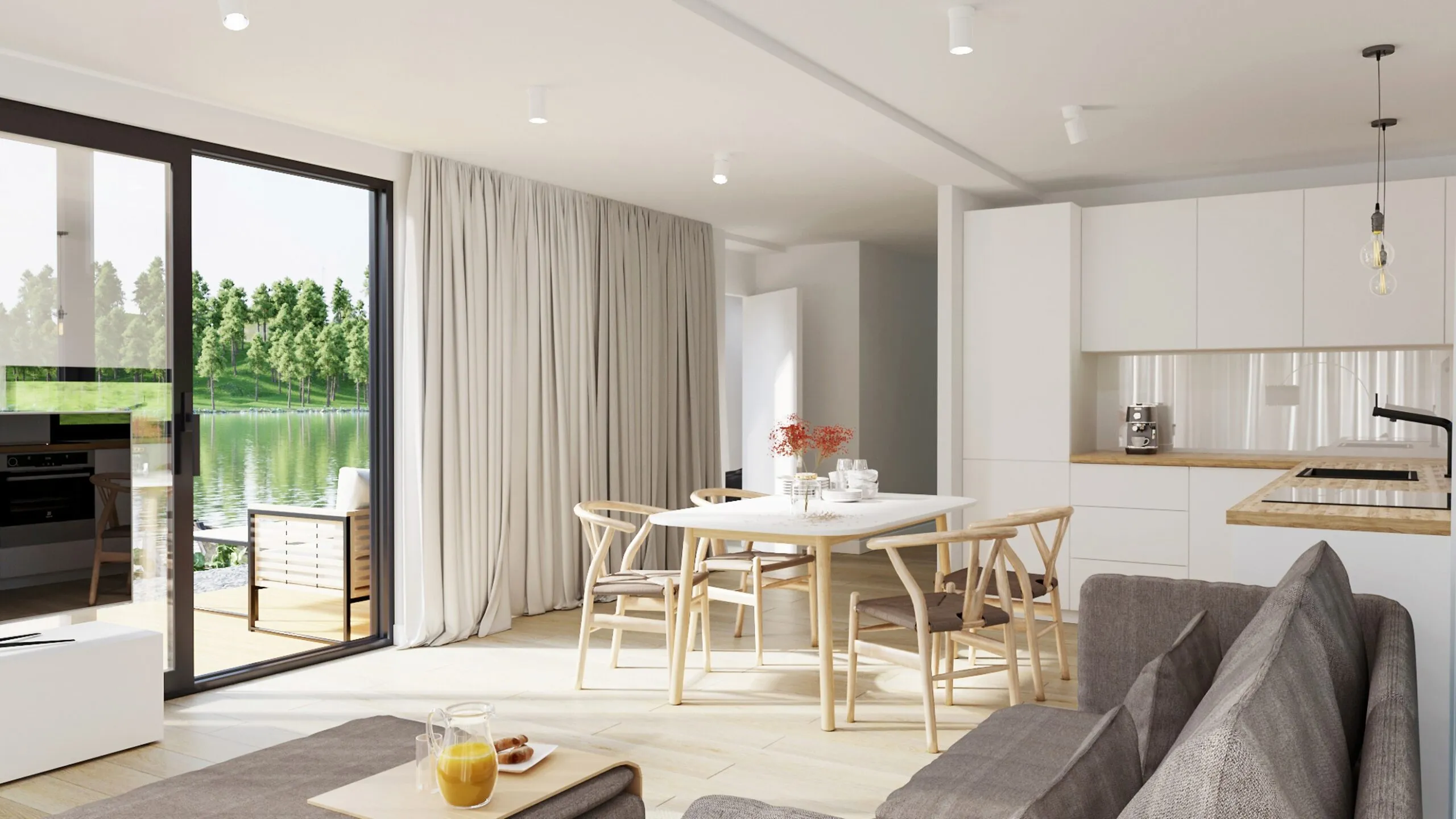 • Internal dimensions: 4.36 x 11.8 x h 2.45 m plus 2.00 x 5.6 x 2.45, internal area 62.6 m2: living room with kitchen 24.5 m2, bedroom 10.7 m2, dressing room 2.9 m2, children’s room 6.1 m2, bathroom 5.4 m2 corridor 12.3 m2
