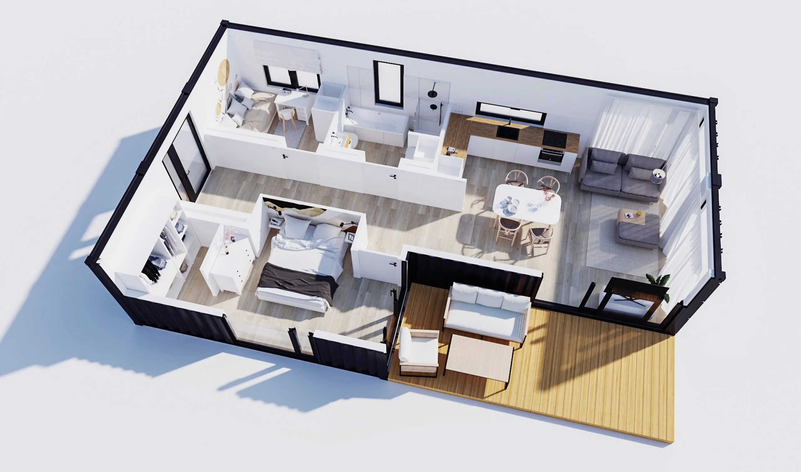 Cutting out and removing parts of the container steel wall, to prepare construction for windows and doors fitting. Prefabrication and high-quality welding. Precision and care for the high aesthetic of performed works.